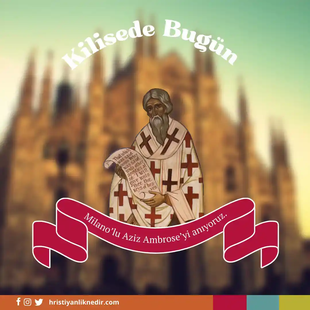 Kilisede bugün pastör ve ilahi yazarı Milano’lu Aziz Ambrose’yi anıyoruz. Kendisi M.S 340’ta Trier şehrinde doğmuştur. Ayrıca kilisenin Aziz Agustin, Jerome ve Grigor ile birlikte en iyi dört Latince uzmanından biri olarak kabul edilir. Birçok ilahi yazdı. O dönemler Milano çevresinde yaygın olan antik litürjiyle ilahiler söylemesiyle de meşhurdu. Aynı zamanda sivil hayatında bir vali…