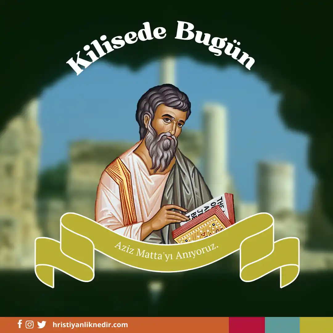 Kilisede bugün müjdeci ve 12 havariden biri olan Levi diye de bilinen Aziz Matta anılıyor. Mesih tarafından takipçisi olmak için çağrılmış, ardından on ikilerden biri olmuştur. Vergi memuru olmasına karşın malını ve makamını bırakarak Mesih’in ardı sıra gitmiştir. Daha sonraları bir müjdeci olmuş ve Kutsal Ruh’un esintisiyle Matta kısmını yazmıştır İncil’in. Matta kısmı İsa Mesih’in…